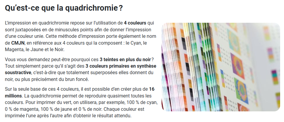 Ce procédé garantit un résultat final meilleur avec des teintes précises et prononcées. Il est souvent utilisé pour les projets où l’on doit respecter une charte graphique spécifique.