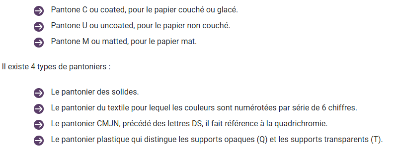 De l’autre côté, on a un système Pantone ou PMS (Pantone Matching System) créé par « Pantone Inc » en 1963, l’impression fonctionne avec des encres spécifiques. Les teintes sont catégorisées dans un nuancier de couleurs intitulé Pantonier qui s’appuie sur 14 couleurs de base que l’on obtient grâce à un mélange réalisé avant l’impression du document.